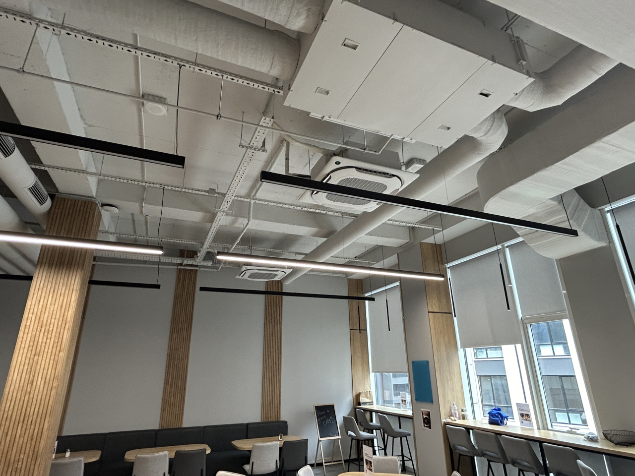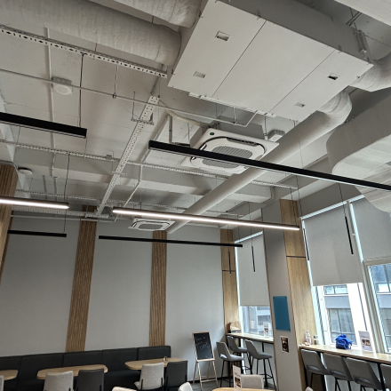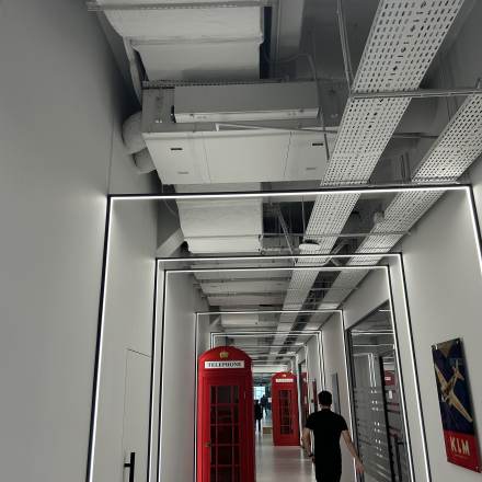 Реализована система приточно-вытяжной вентиляции на базе 15 установок Aerostar Slimstar (2000 м³/ч) с рекуперацией тепла, датчиками CO₂ и автоматизацией, обеспечивающая энергоэффективный воздухообмен и адаптацию под фактическую загрузку помещений.